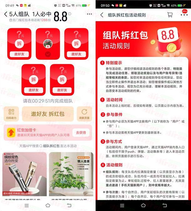 小编提示:打开“天猫”APP搜索【组队拆红包】进去,5人组队成功后,其中1人必得8.8元无门槛红包