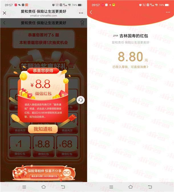 吉林国寿爱和责任答题抽1-68元微信红包 亲测中8.8元秒推