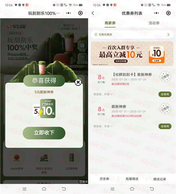 参加沪上阿姨举办的刮刮乐抽无门槛神券活动,通过打开微信进去小程序活动里,进去直接抽,中到5元膨胀神券之后再去膨胀一下,可以得到最高10元无门槛券,然后就可以在任意门店下单使用,不管膨胀中多少元,都可以0元喝奶茶。
