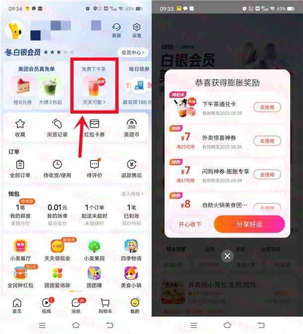 小编提示:打开“美团”APP,在【我的】页面点【免费下午茶】进去,每天都可以免费膨胀抽奖1次,刚中1张奶茶免单券,非必中