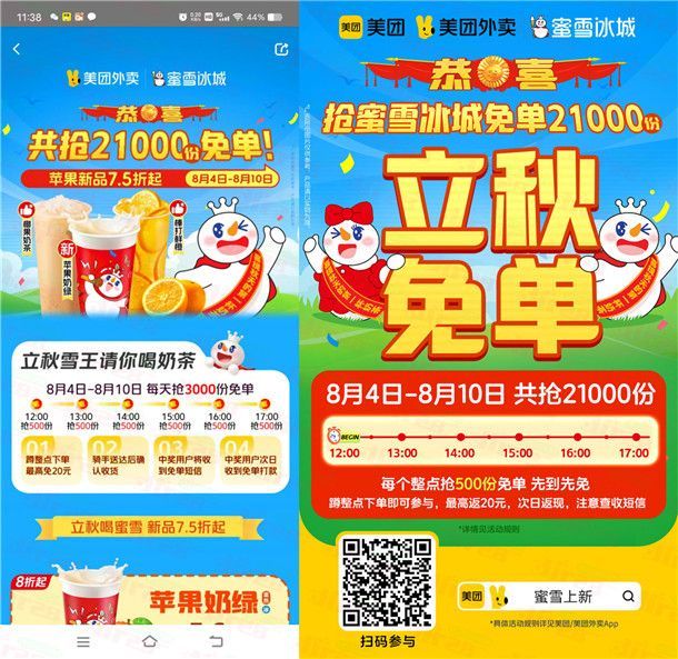 参加蜜雪冰城举办的秋天的第一杯奶茶每天抢3000份免单活动,通过打开美团APP搜索【蜜雪免单】进去活动里,每天12点、13点、14点、15点、16点、17点整抢500份18减18元大额神券,每个整点数量限量。