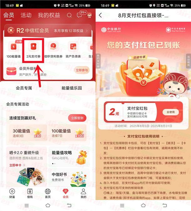 参加中信银行举办的红会员8月领支付红包活动,通过打开“中信银行”APP,点底部“会员”再点“2元支付券”进去领取,需要手动兑换到支付宝,秒到支付宝卡包里,满50元减2元,注册过中信银行二类电子卡的也可以去。