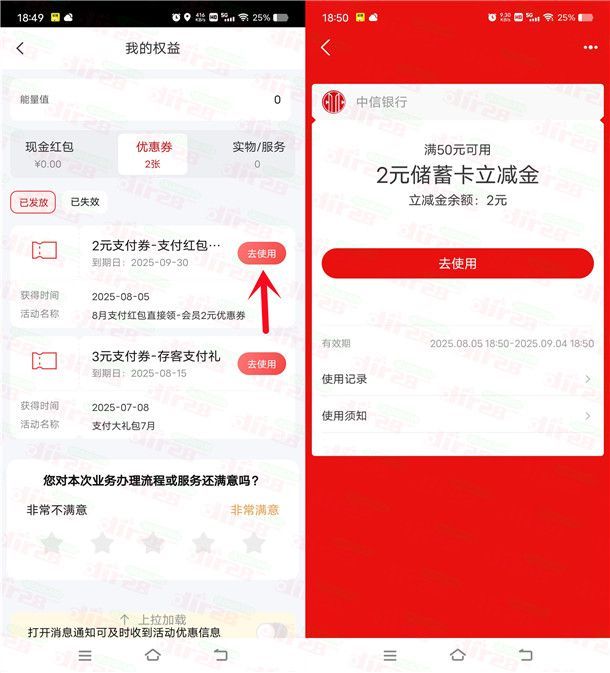 小编提示:打开“中信银行”APP,点底部【会员】再点【2元支付券】进去领取,需要手动兑换到支付宝,秒到支付宝卡包里,满50元减2元,注册过中信银行二类电子卡的也可以去
