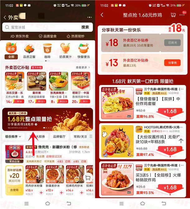京东外卖每个整点1.68元抢炸鸡 每天10~22点多场可抢