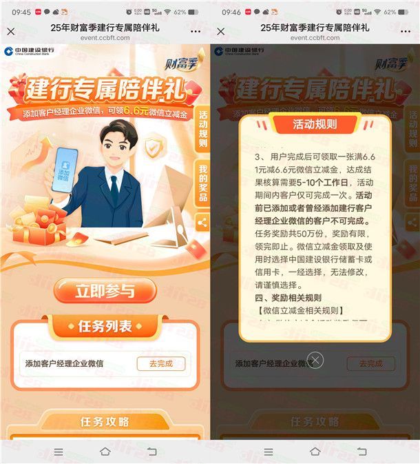 参加建行举办的专属陪伴礼领6.6元微信立减金活动,通过打开微信进去活动里,报名后首次添加客户经理就可以领6.6元微信立减金,添加后数据有几天的延迟时间,等于首次添加后需要几天后再去领,限量50万份。