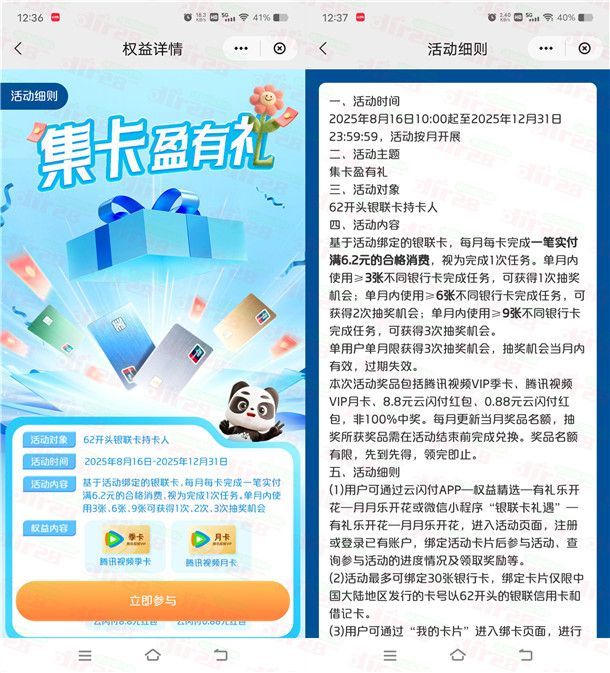 云闪付集卡盈有礼抽0.88-8.8元云闪付红包、腾讯视频会员月卡