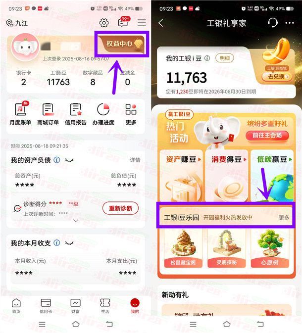 小编提示:打开“中国工商银行”APP【我的】页面点【权益中心】进去,再点工银i豆乐园进去,点左下角【我们开学啦】进去完成简单的任务抽,刚中6666个i豆+5000个i豆
