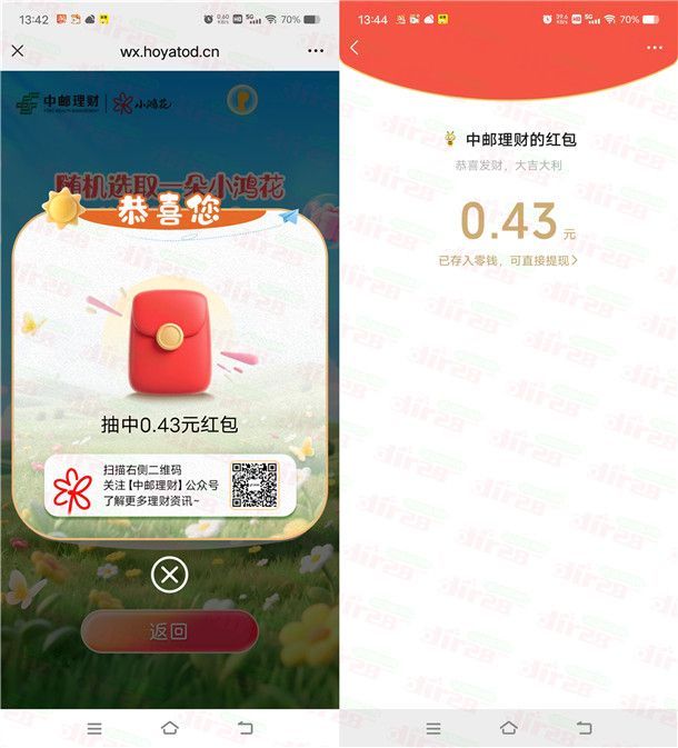 中邮理财种小鸿花抽随机微信红包、京东卡 亲测中0.43元
