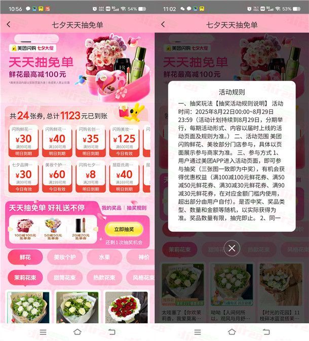 美团七夕每天抽30-100元鲜花免单券 还可领大额鲜花券