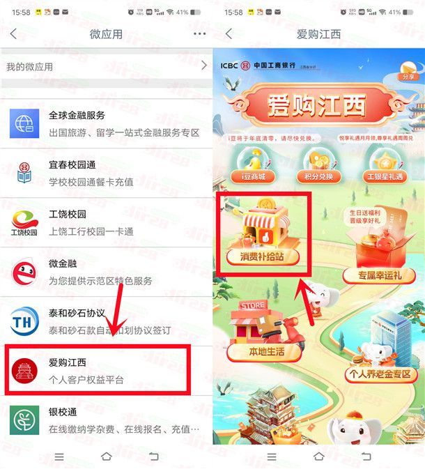 小编提示:需要江西工行才可以,打开“中国工商银行”APP搜索【微应用】点【爱购江西】进去,点【消费补给站】根据借记卡、和信用卡可以领3-88元微信立减金,别领错了,刚中3元