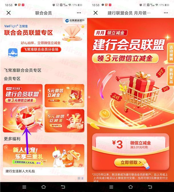 建行会员联盟简单领3元微信立减金 亲测秒到 数量限量