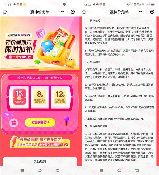 参加美团举办的赢神价免单活动,通过打开微信进去活动里,每个人可以直接抽奖1次,有机会中到满15-15元闪购免单券,共5万份免单券,如果没中可以换号抽,非必中。