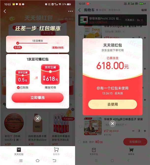 参加京东金融举办的天天领红包抽最高618元支付红包活动,通过打开“京东金融”APP搜索【天天领红包】进去直接抽,中到的支付红包后,可以买京东的商品抵扣,可以先在“京东”买商品加入购物车,然后再去“京东金融”APP搜索【购物车】再去支付就可以抵扣。
