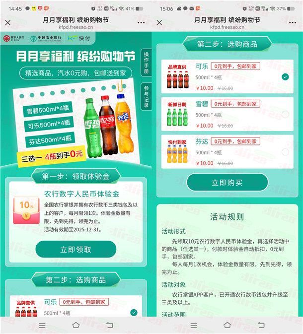 这个活动是农行领10元数字人民币红包的活动,通过先打开中国农业银行APP进去活动里,可以直接领到10元数字人民币红包,领到红包之后再去购买4瓶可乐或者饮料,用农行数字人民币付款,就是0元。