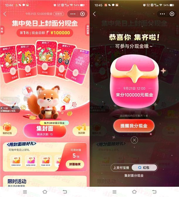支付宝集中免日上封面瓜分10万元现金红包 9月21日12点瓜分