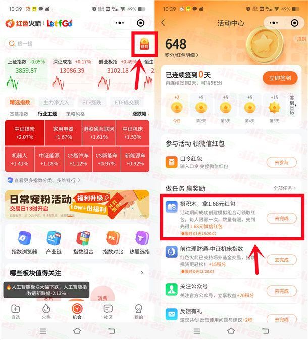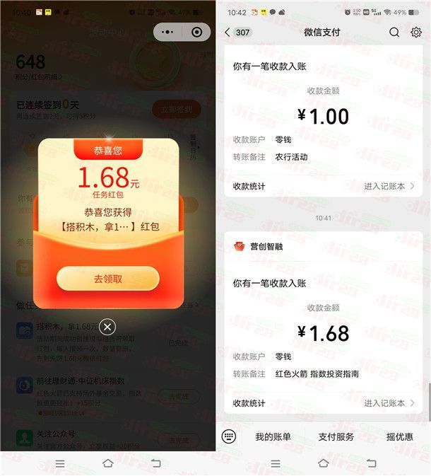 参加红色火箭小程序举办的搭积木小任务领1.68元红包活动,通过打开微信进去红色火箭微信小程序里,点击右上角签到图标进去,看看有没有【搭积木拿1.68元红包】的任务,如果有就点击进去,随便创建一个模拟组合,就可以领1.68元红包,部分用户才有入口,数量限量。