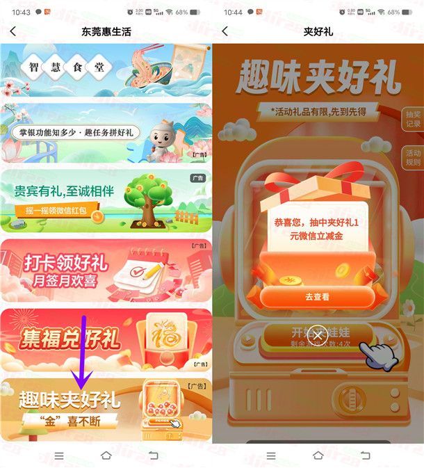 农行趣味夹好礼必中1-50元微信立减金 亲测中3元 限部分用户