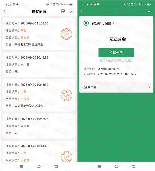 参加农行举办的趣味夹好礼必中最高50元微信立减金活动,通过打开中国农业银行APP进去活动里,每支付0.02元可以抽1次,刚中3个1元微信立减金,得到的立减金需要手动领取秒到,全国都可以去,部分用户如果提示非受邀就参加不了。