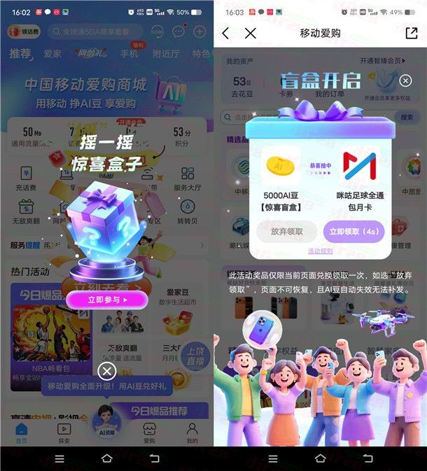 小编提示:打开“中国移动”APP,直接摇手机点击弹窗进去会自动抽奖1次,有机会中到腾讯、爱奇艺、芒果TV会员月卡、实物,非必中