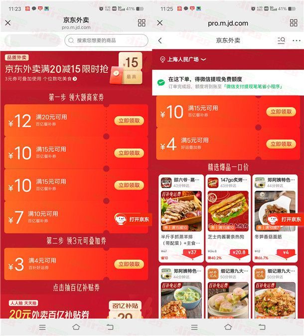 京东每天领15减10元外卖券、满5减4元外卖叠加券红包