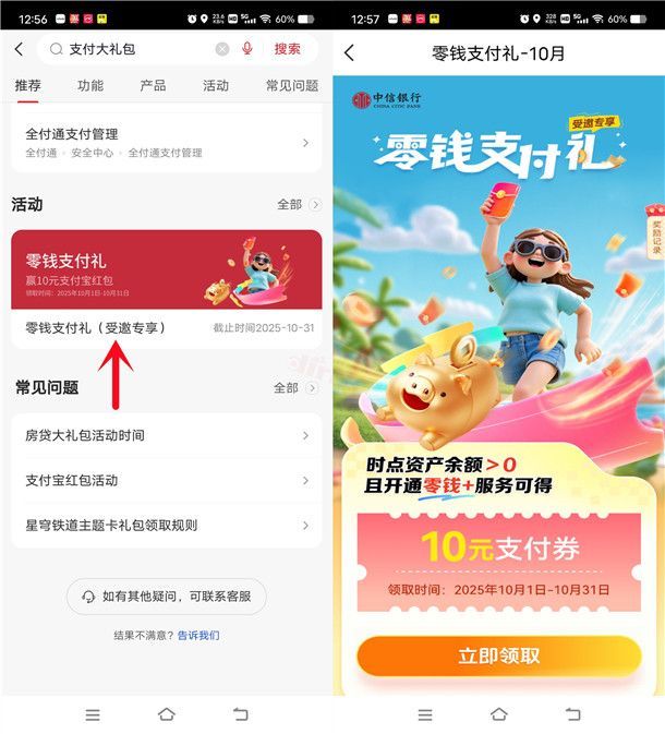 中信银行10月零钱支付礼活动领取10元支付券 限部分用户