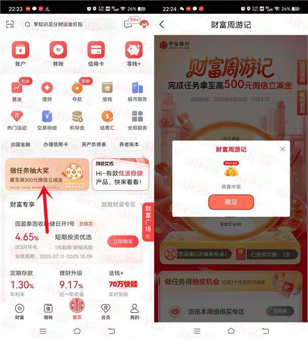 中信银行财富周游记抽1-500元微信立减金 亲测中1元秒到