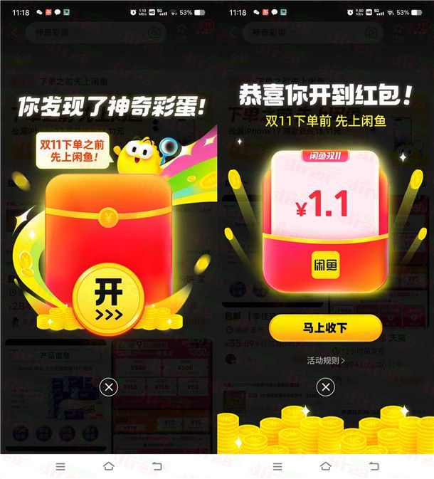 闲鱼神奇彩蛋抽最高1111元无门槛红包 亲测中1.1元 可买京东卡
