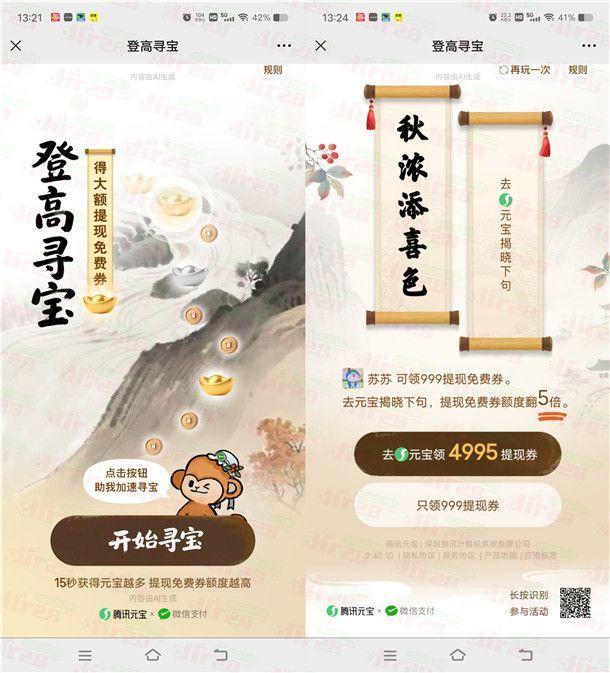 参加微信登高寻宝小游戏领免费提现券活动,通过打开微信进去活动里,完成简单的小游戏,可以领到最少几千微信免费提现券(需要去腾讯元宝领),如果不满意分数可以反复玩,提现券可以用于微信提现的时候免手续费。