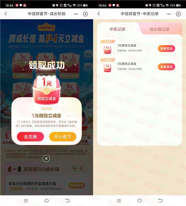 中信银行攒成长值领2-14元微信立减金 保底必中最低2元