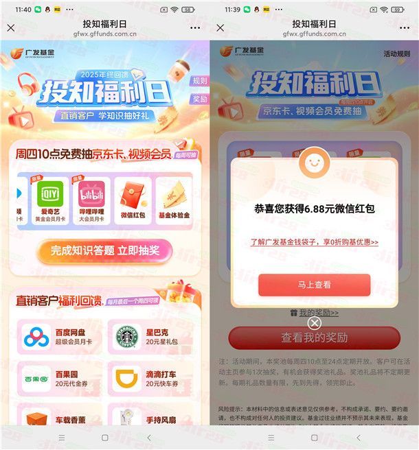 参加广发基金举办的周四投知福利日答题抽红包活动,通过打开微信进去活动里,每周四都可以参加,打完1道题就可以抽奖,有机会中到随机金额微信红包、各大视频会员,小编测试中到6.88元红包,中到红包需要注册领,非必中。