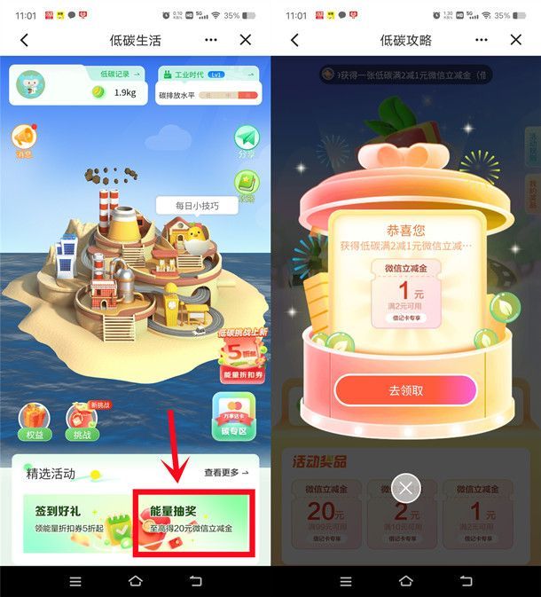 建设银行低碳生活能量抽1-20元微信立减金 亲测中1元秒到