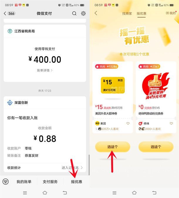 微信支付摇优惠的这个活动每天都可以去参加1次,通过打开微信进去【微信支付】里点击右下角【摇优惠】进去,每天都可以抽奖1次,可以抽京东外卖券、和京东外卖叠加券、以及美团外卖券等等,如果微信支付没有摇优惠的菜单栏就更新微信APP或者过几天再去,并非每个号都有摇优惠入口。
