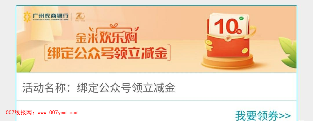 广州农村商业银行(珠江直销)有卡的,“广州农村商业银行”公众号——金米福利——特邀客户活动,绑卡领10元微信立减金。以前领过的换V绑领。
