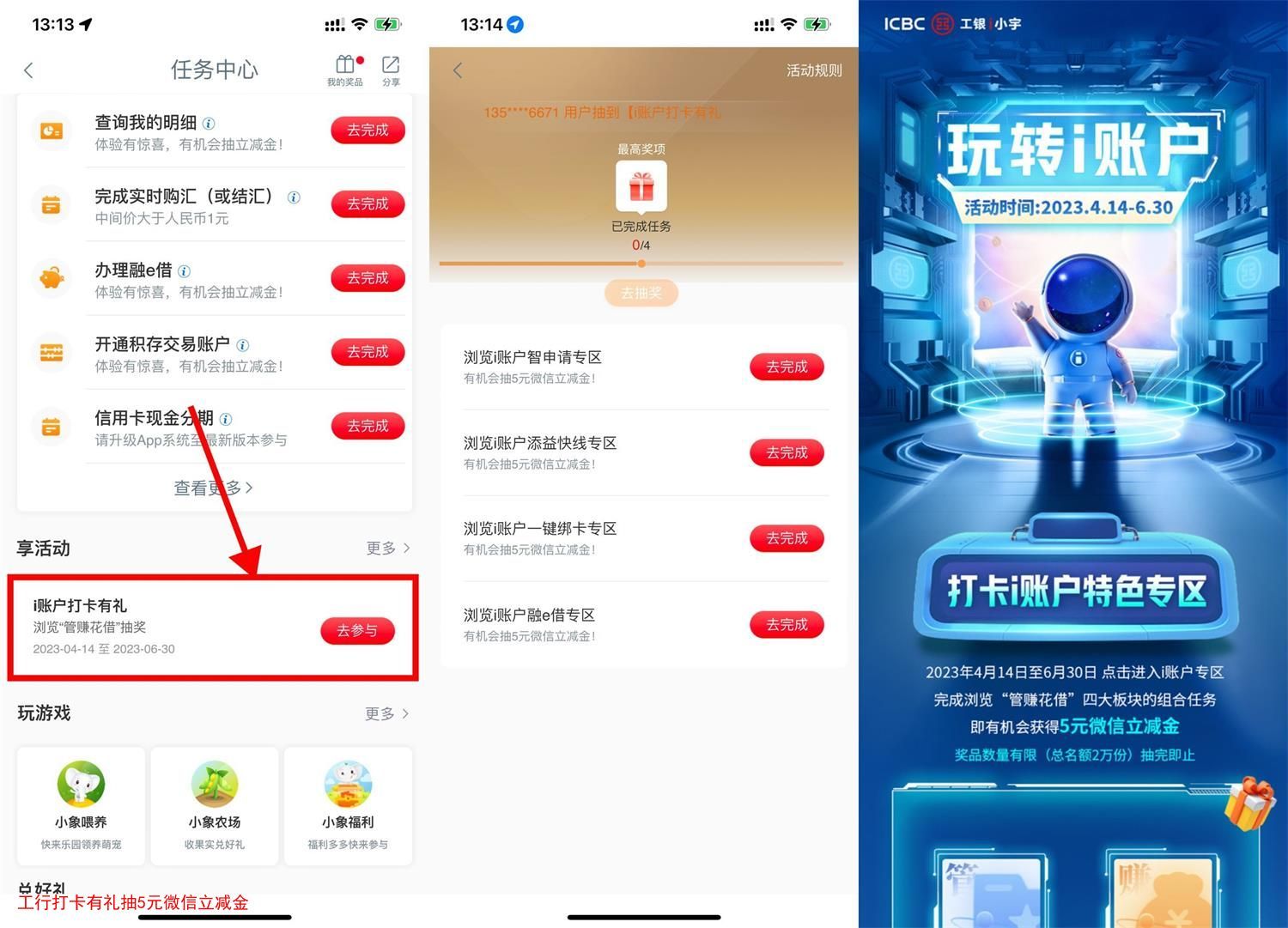 工行APP搜索“任务中心”->下拉“i账户打卡有礼”->完成4个浏览任务抽5元微信立减金