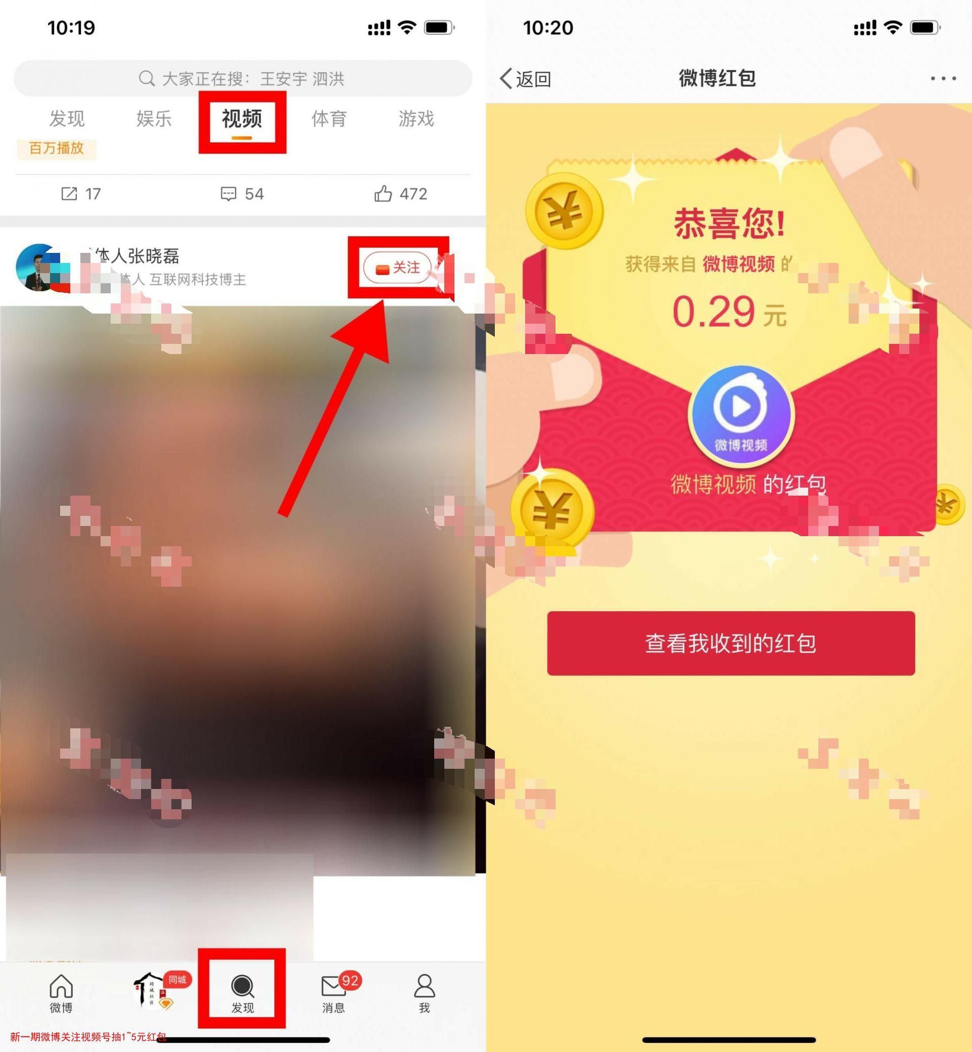 打开微博APP->底部“发现”->顶部“视频”->显示有红包标志的就关注->多关注点->都提示很遗憾只能换号参加->然后去消息里拆开红包->最多得5个红包!(如果关注几个博主都提示不中就不要做了,因为你这个微博是不会中的)