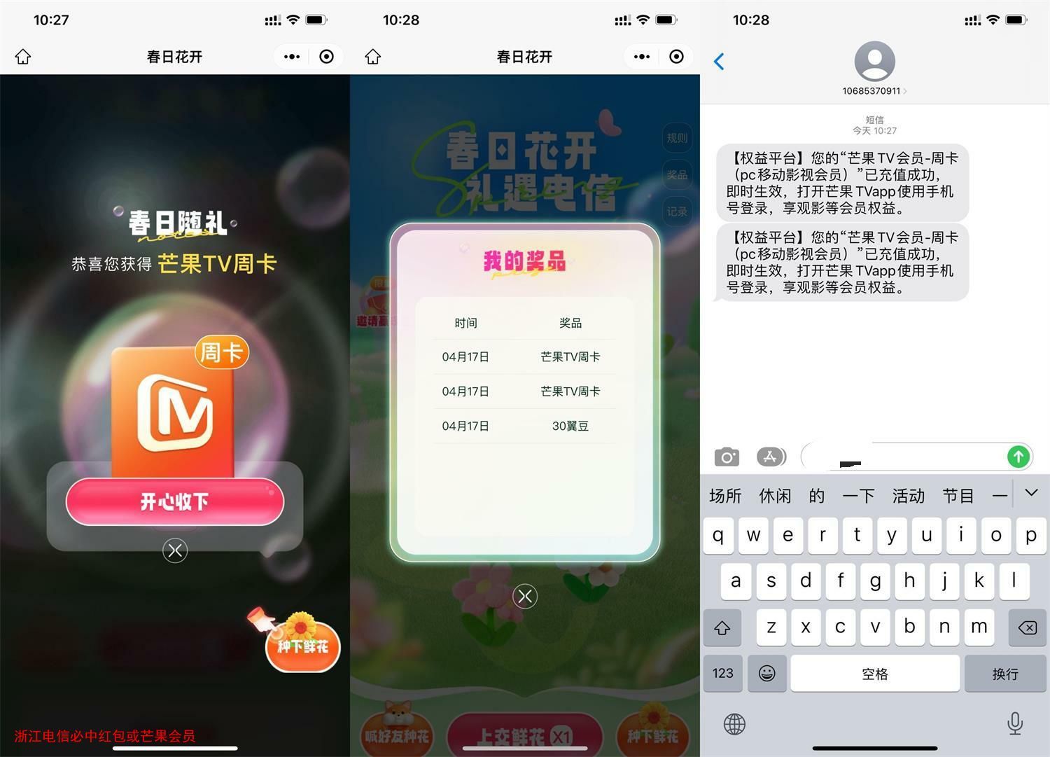 浙江电信必中红包或芒果会员