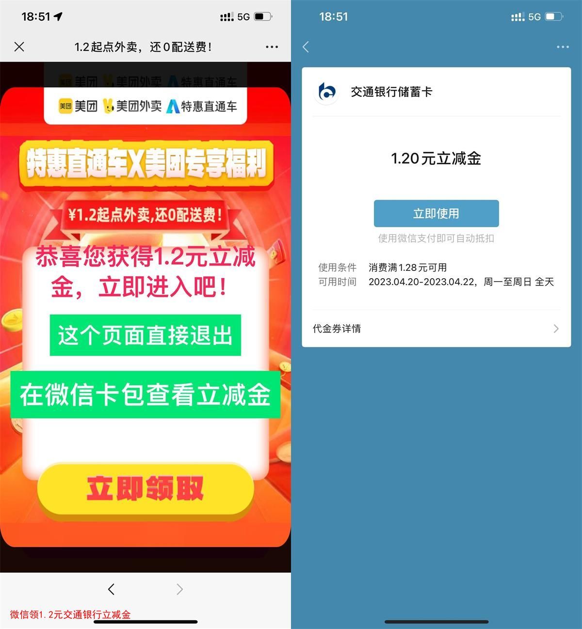 微信打开地址->点图进入后点立即领取,到图1这个页面就可以退出了,在微信卡包中查看立减金
