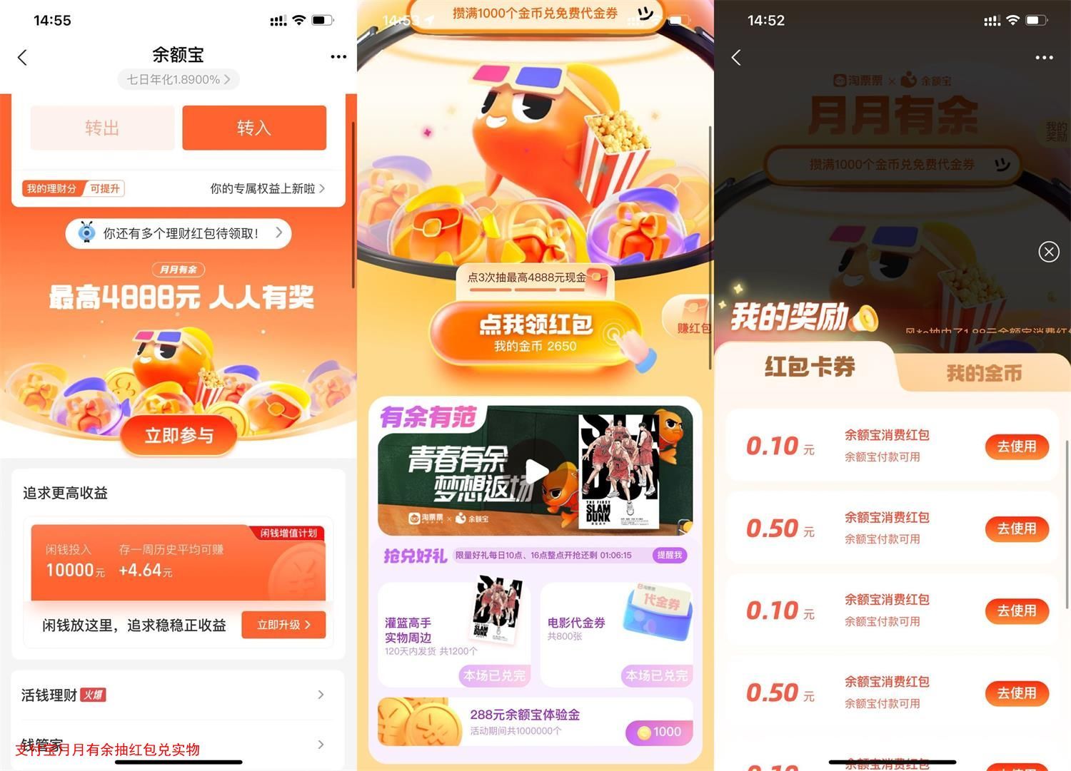 支付宝APP进入“余额宝-人人有奖”->每次点击会弹出随机任务,领余额宝消费红包->集满1000个金币每天10点、16点兑换实物或电影票