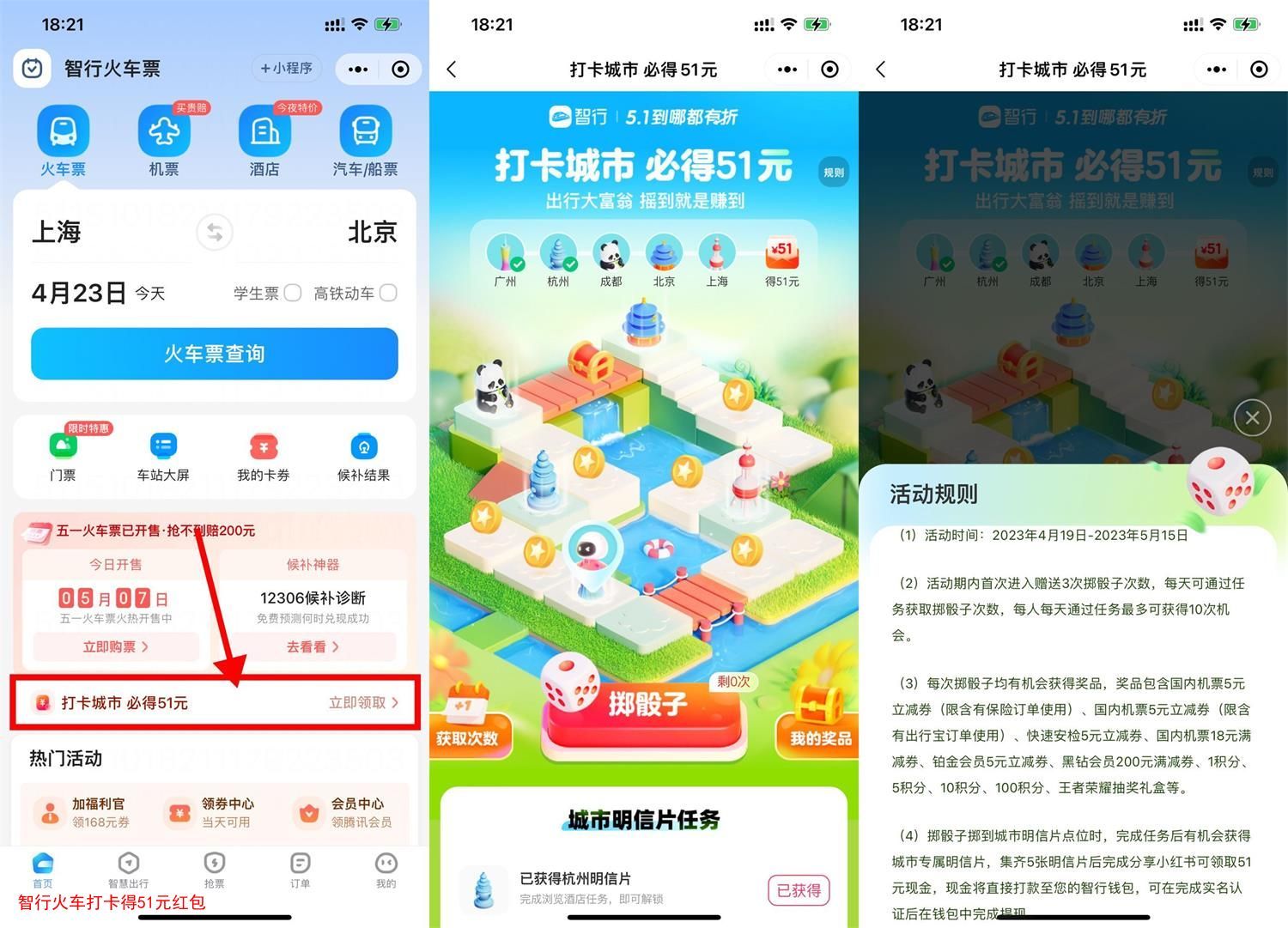 微信进入小程序“智行火车票”->点击横幅进入->每天简单浏览得骰子次数,成功打卡5座城市并分享小红书领51元红包