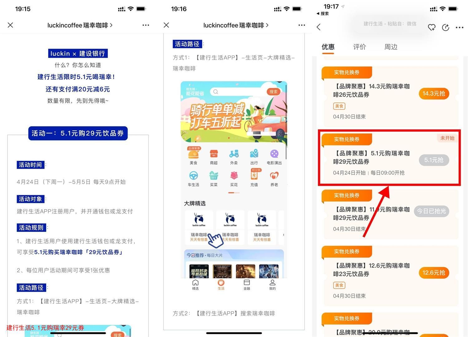 建行生活APP->搜索“瑞幸咖啡”->每天9点整5.1元购瑞幸咖啡29元饮品券,活动截止到5月5日