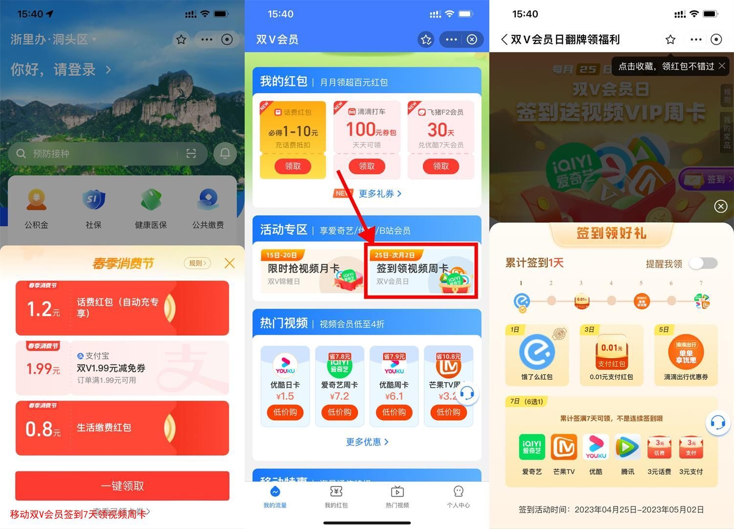 支付宝搜索“双V会员”->活动专区“签到领视频周卡”->连续签到7天领取视频会员周卡