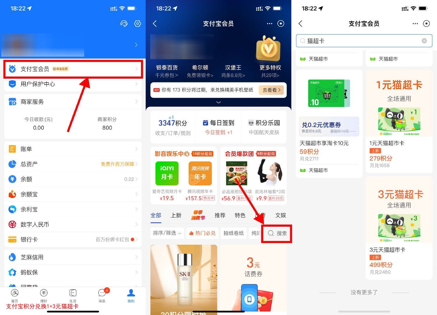 支付宝积分兑换1+3元猫超卡