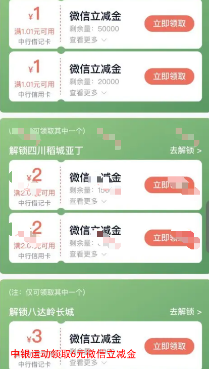 微信进入小程序“中银运动+”->能量驿站健步兑好礼->线上赛“爱运动找中行”->累计微信步数解锁领1+2+3元中国银行立减金,刷步数可百度刷步网,每日步数上限为2万步。
