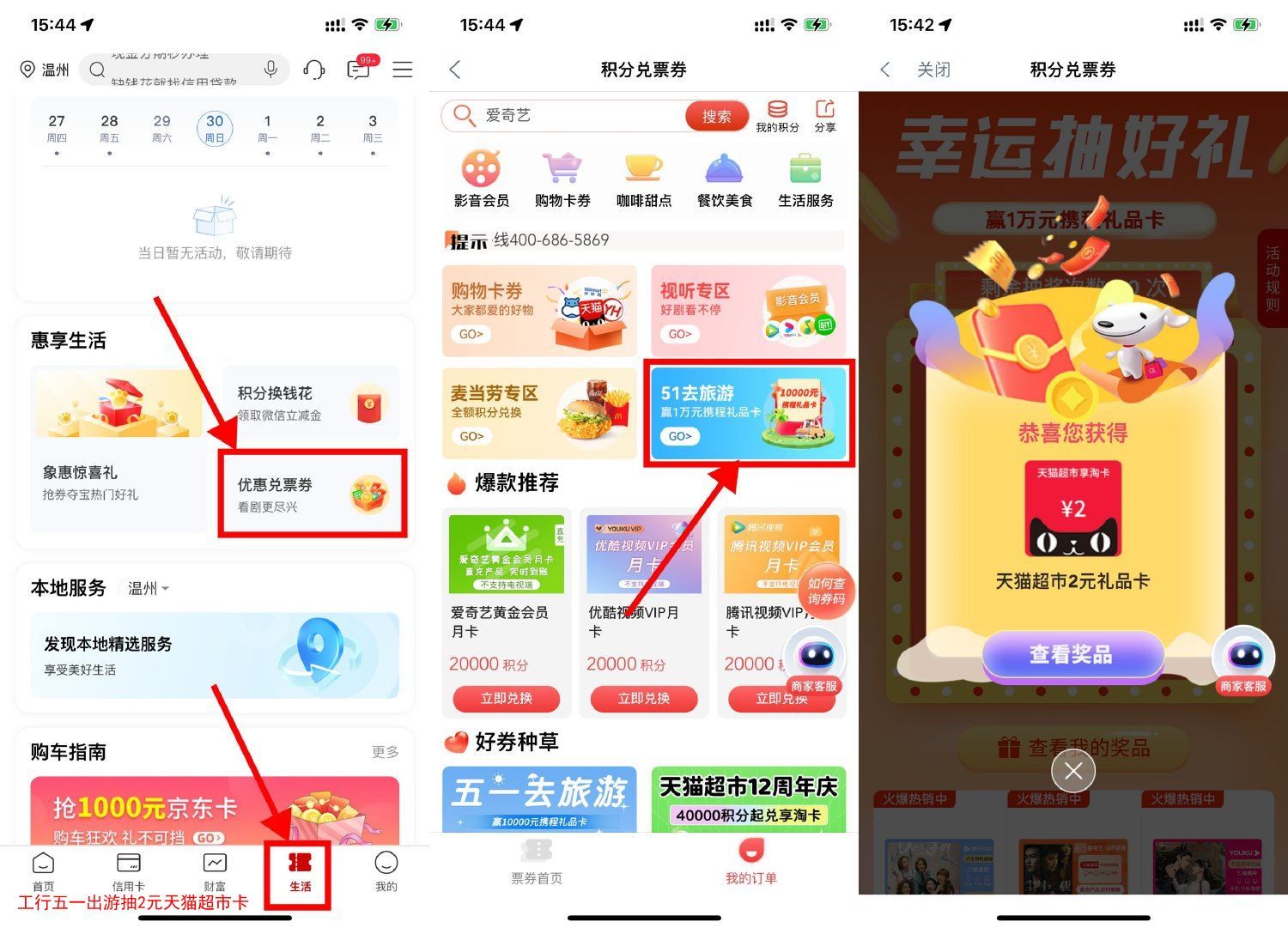 工行五一出游抽2元天猫超市卡