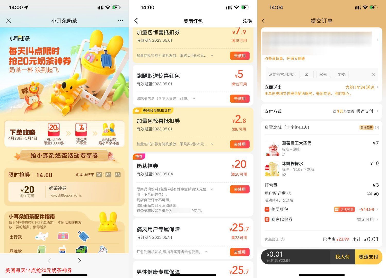 美团每天14点抢20元奶茶神券