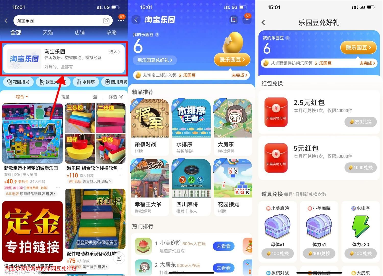 淘宝APP搜索“淘宝乐园”->每天签到、玩游戏得乐园豆->累计250/1000乐园豆兑换2.5/5元天猫通用购物红包