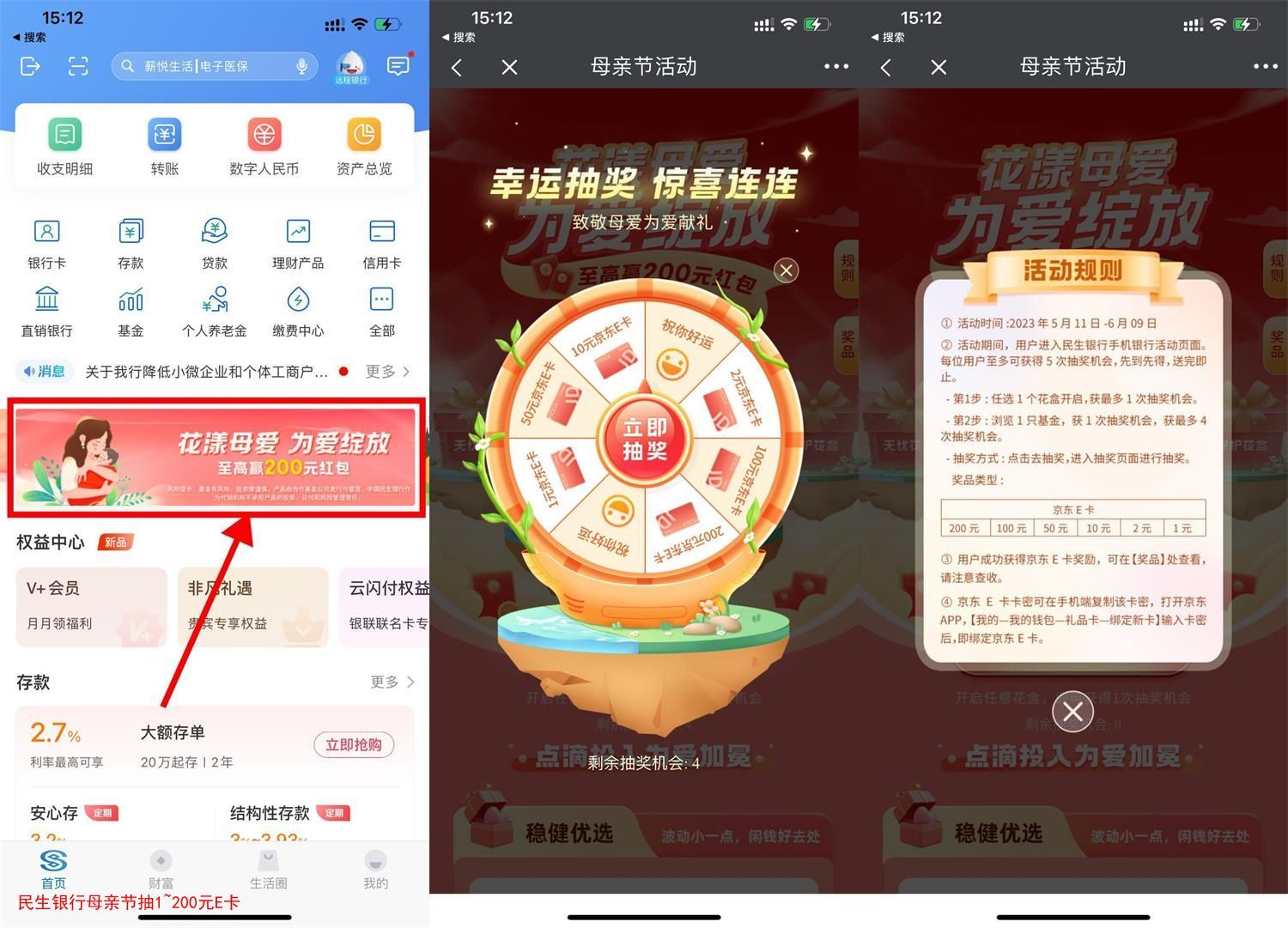 民生银行母亲节抽1~200元E卡