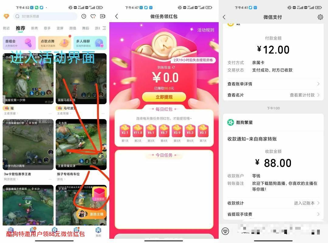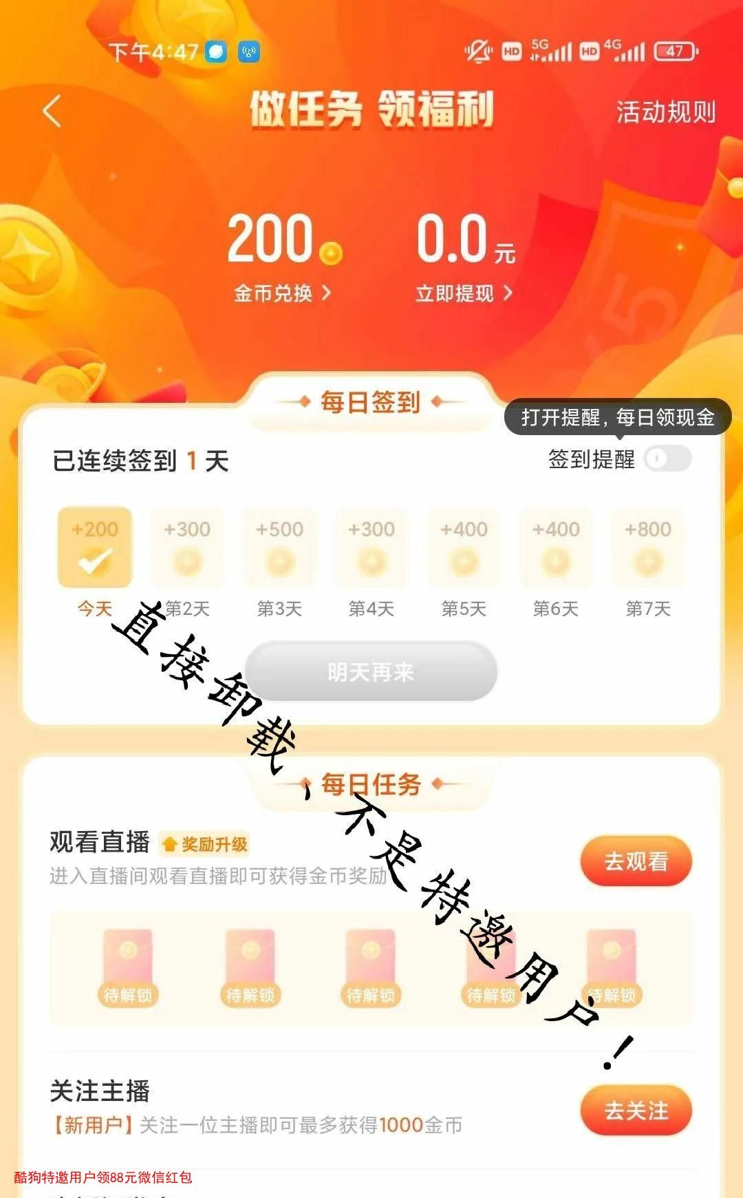 2、如果是能参与的话->直接打卡签到7天领88元现金红包->签到内容也就是看直播关注主播->非常简单->提现秒到微信零钱->无需拉人!