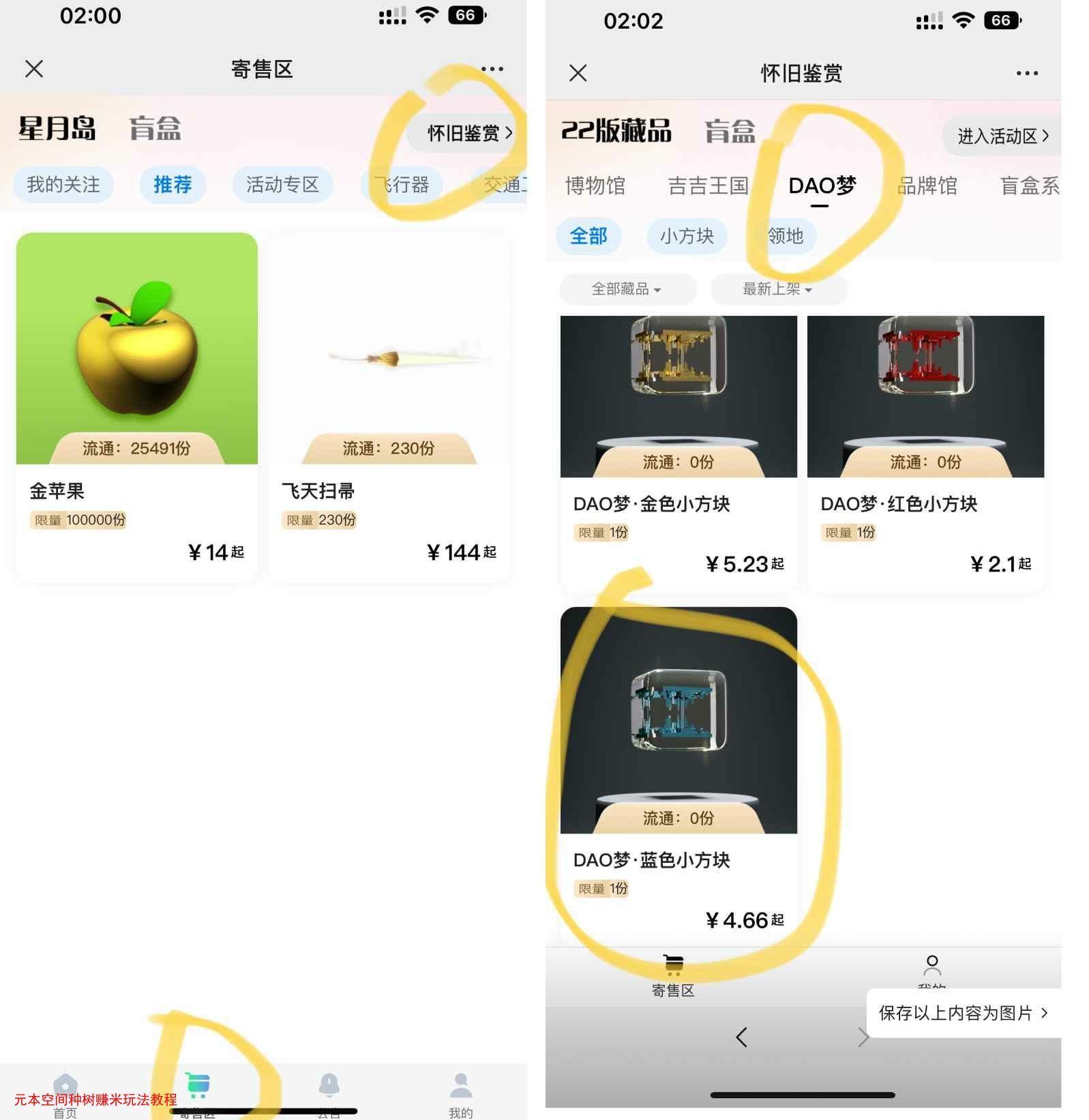 开通好杉德钱包,然后去寄售区-右上角怀旧鉴赏-DAO梦专区买5个蓝色小方块
