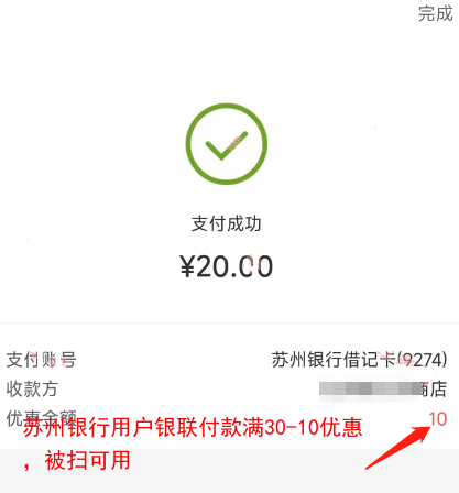 苏州银行用户银联付款满30-10优惠,被扫可用